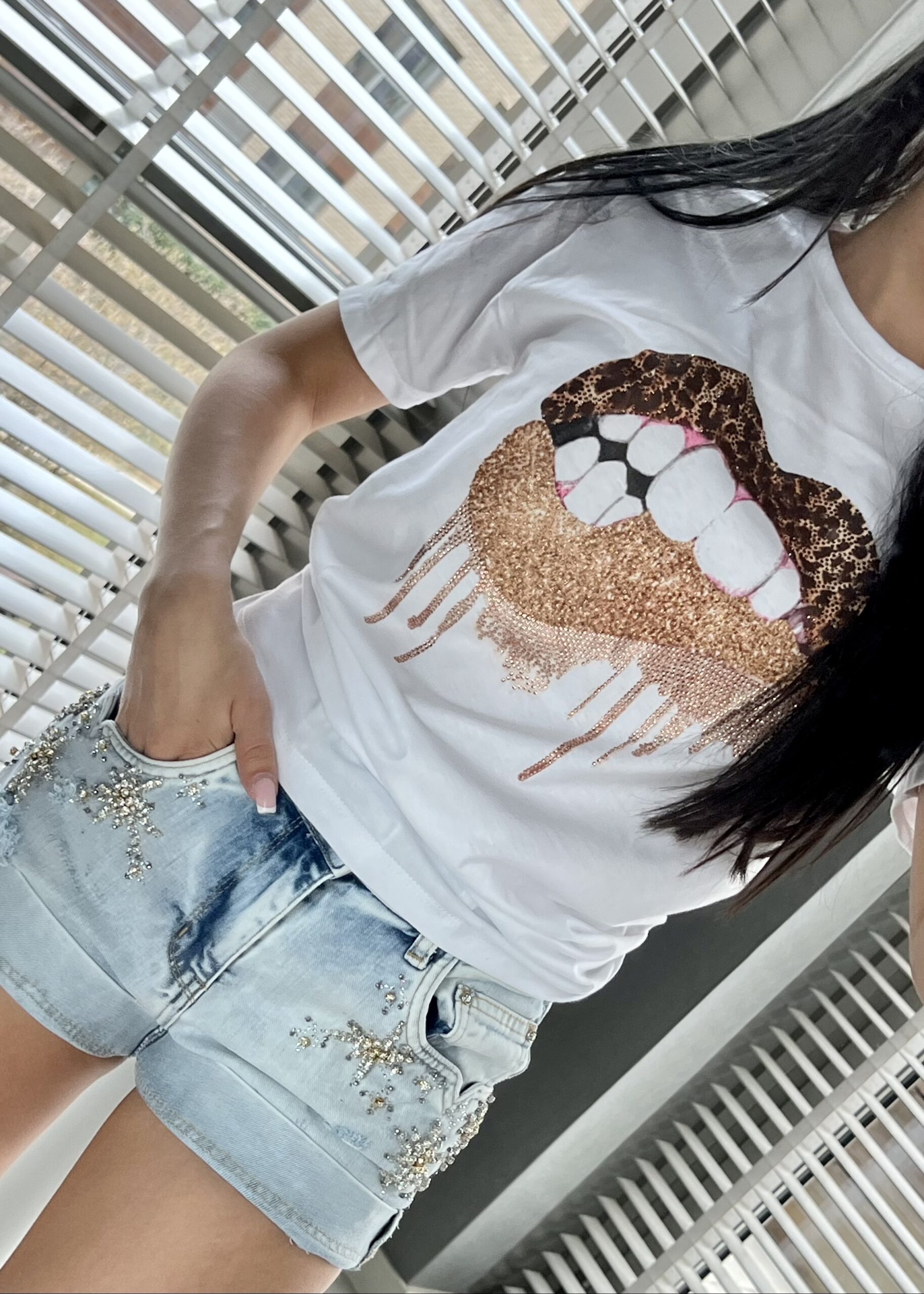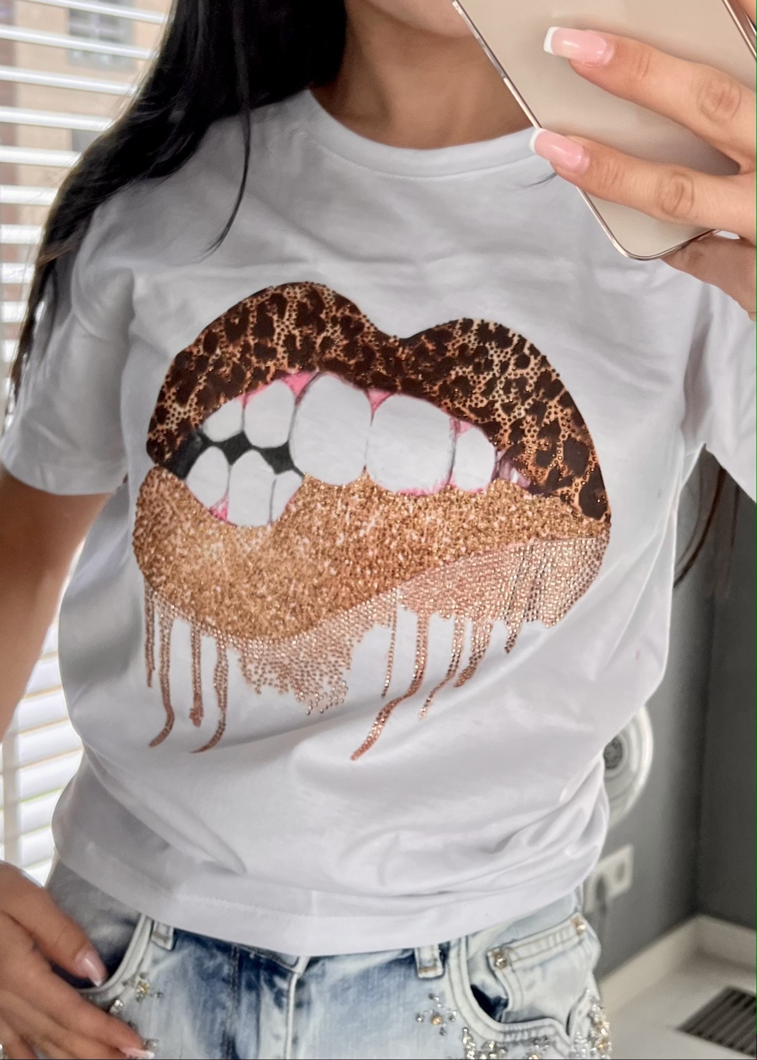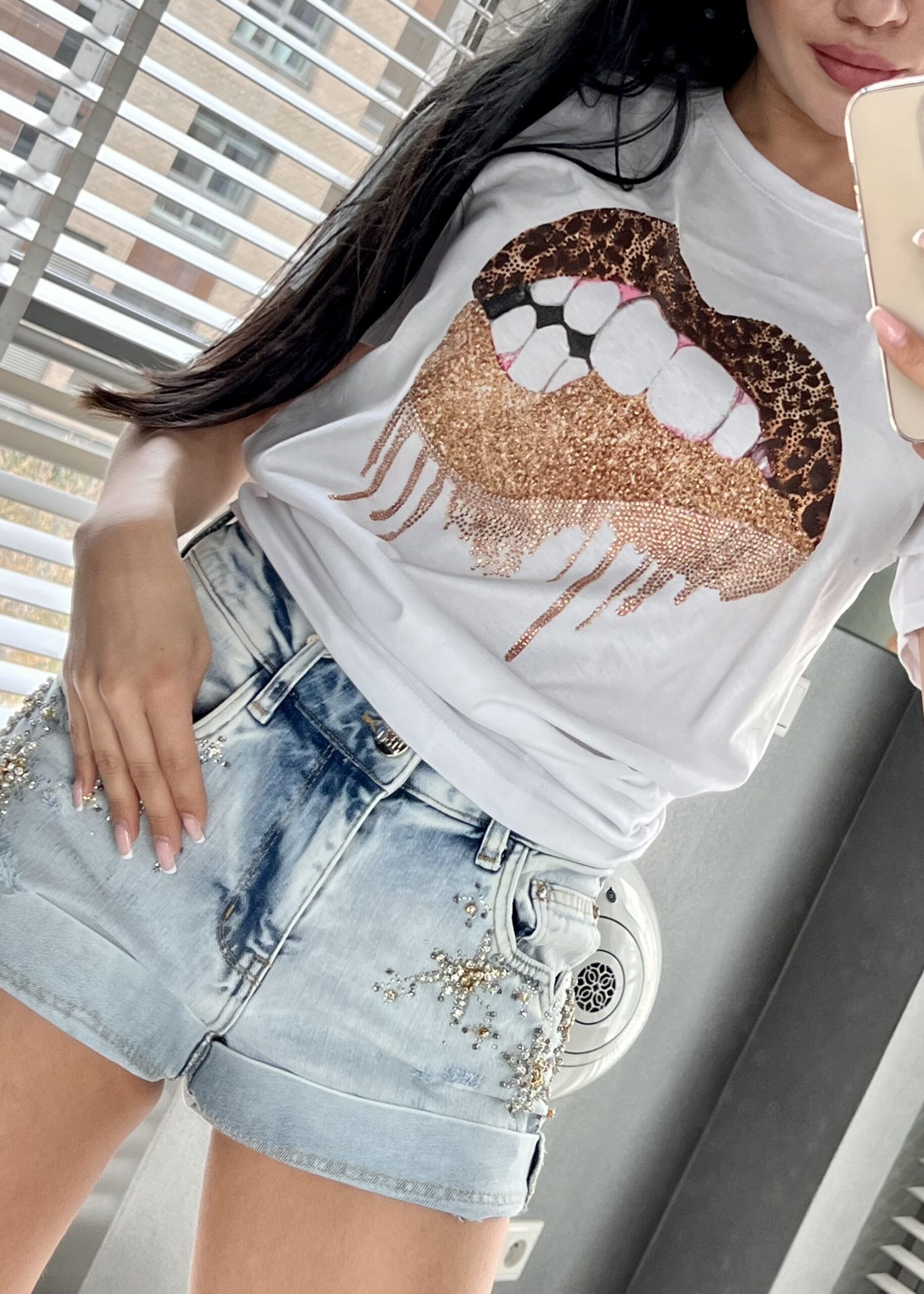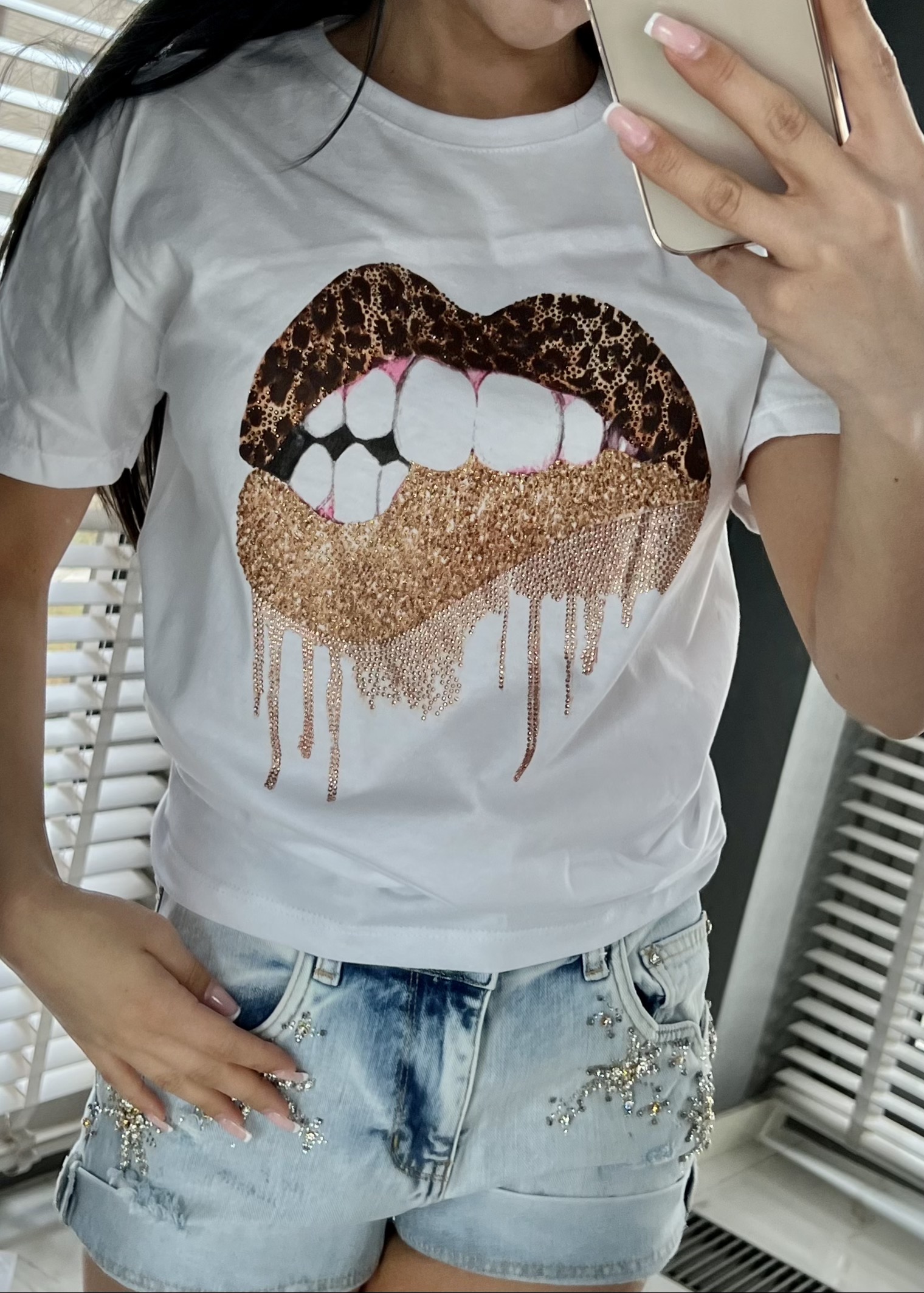 Biały t-shirt LIPS wykonany czystej bawełny . Przepięknie zdobione logo cyrkoniami idealnie komponuje się ze spodniami, szortami i spódnicami. T-shirt występuje w rozmiarze S, M oraz L.