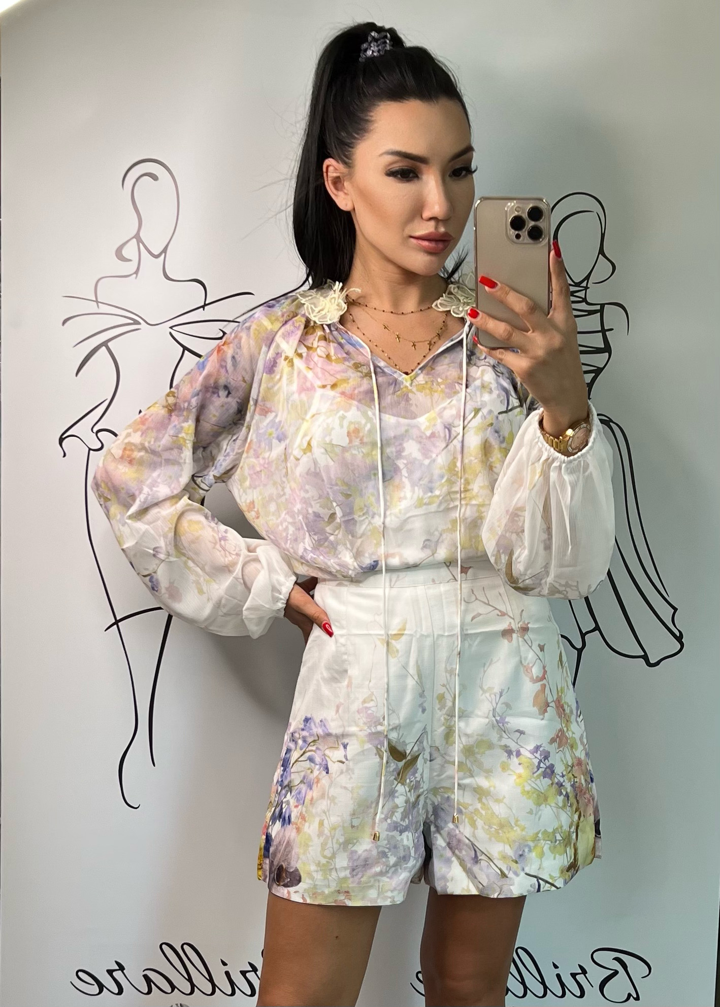 Bardzo elegancki zestaw koszula szyfonowa z halką w tym samym princie i szorty wysoki stan.Komplety w roz S,M.Wzorowany na modelach Zimermana. Wymiary roz S szorty pas 70cm ,wysoki stan 38cm,długość szortów całkowita 42cm.Koszula biust do 116 cm.Wymiary roz M szorty pas 74cm ,wysoki stan 38 cm długość całkowita 42 cm. Koszula biust do 120 cm .