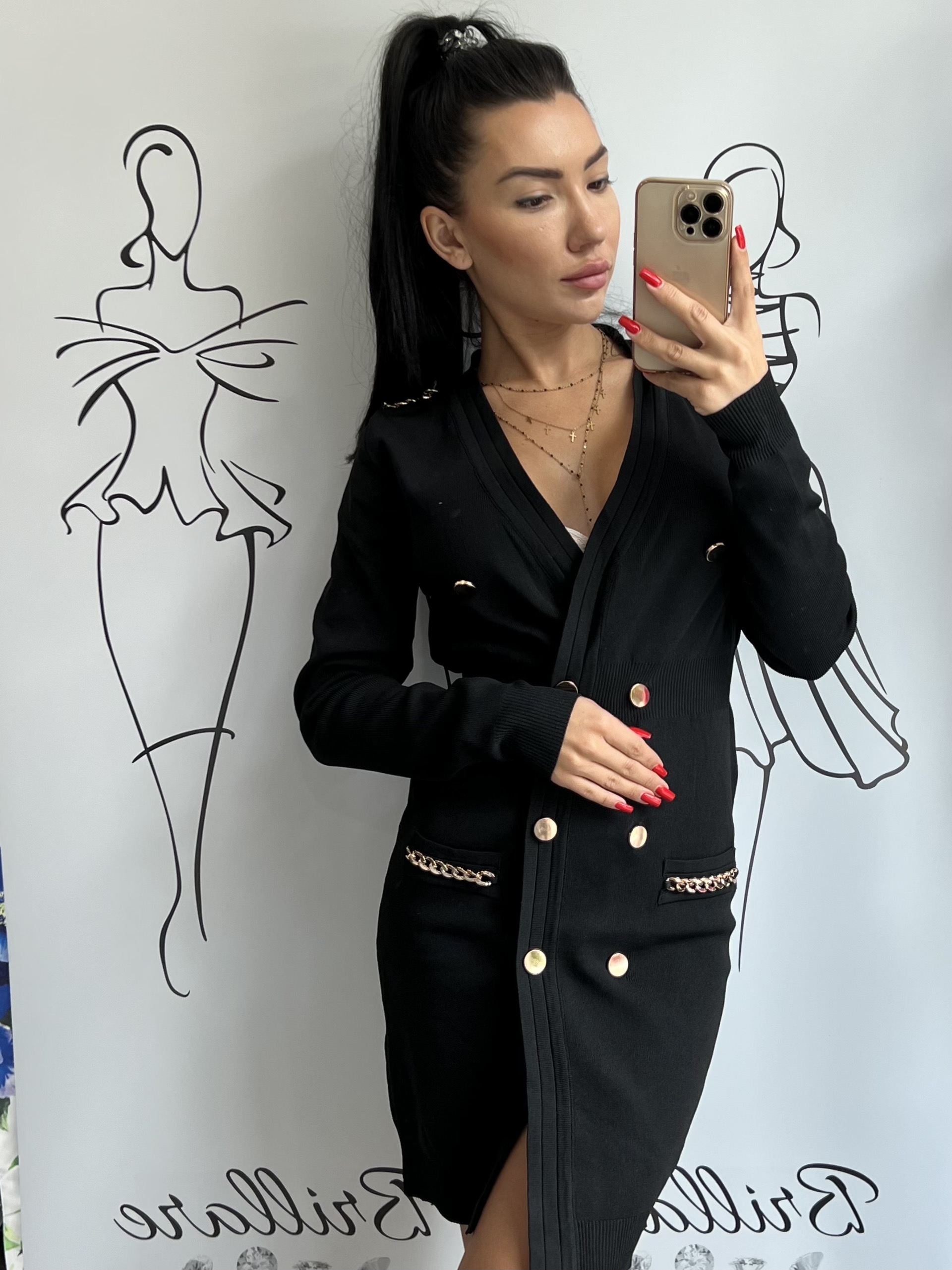 Złote łańcuchy przy kieszonkach i na ramionach dodają sukience wyjątkowego stylu.