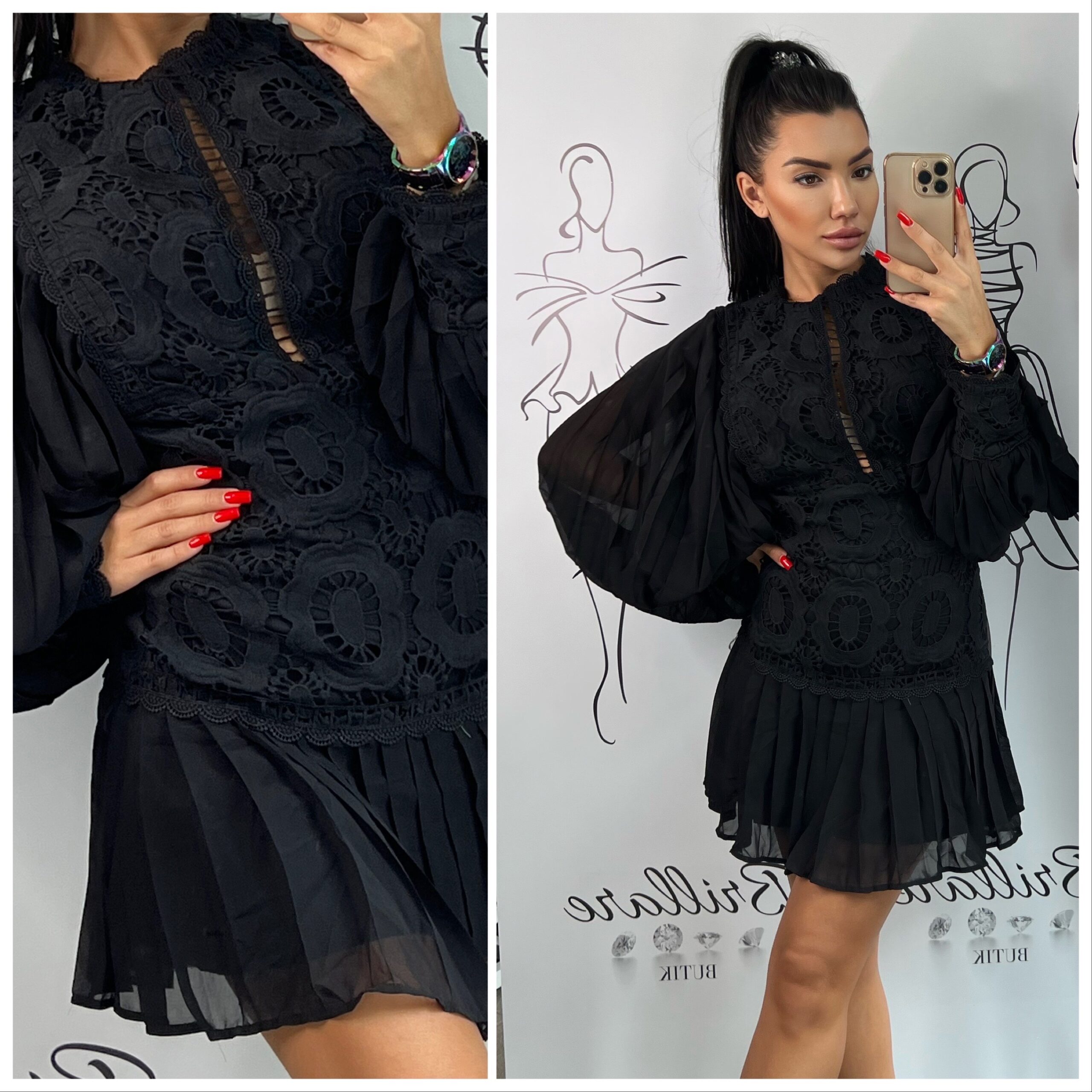 Szerokie szyfonowe rękawy wykończone są mankietem zapinanym na guziki. Dół sukienki wykończony jest szyfonową falbaną.